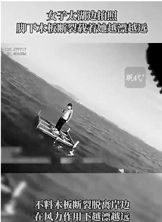 近日,江苏苏州北太湖中央出现惊险一幕:一名女子坐在一块木板上,手里握着一部手机,被困在湖中。原来,女子在太湖边游玩,站在木板上拍照时,不料木板突然断裂脱离岸边。她想自行划回岸边,木板却在风力的作用下越漂越远,无奈只好拨打手机报警求助。警方和渔政部门出动救援船,通过望远镜寻找到女子,所幸救援及时,女子身体无碍。