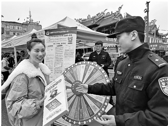 近日,温州市公安局龙湾区分局天河派出所联合市监、工商、街道禁毒等部门,“摆摊”普法。图为社区民警黄振汉利用反诈答题转盘、反诈飞行棋等方式,寓教于乐,给群众送上“反诈大礼包”。