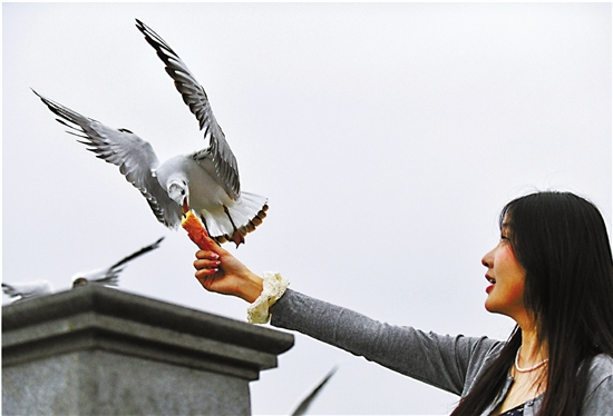 3月20日,游客在昆明海埂大坝喂红嘴鸥。