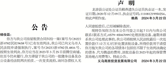 现特告知你方在本公告刊登之日起7日内与我公司联系(联系方式:0579-85067099)处理该批设备,逾期未联系我公司处理此事的,我公司将按照人民法院最后一次处置价款(7.12万元)打折处置该批设备,所得价款用于清偿你方拖欠我公司的各项债务(包括但不限于生效判决确定的债务、代为腾退的费用、该批设备自2023年起的保管费及场地占用费等)。特此公告。