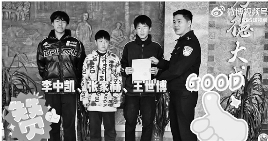 日前,在江苏苏州浮桥镇的篮球场上,浮桥中学学生张家赫、王世博、李中凯捡到了棕色皮包。里面有一根金条、一枚钻戒、银行卡、现金等物品,他们赶紧报警求助,民警通过居住信息联系到了失主彭先生。原来,彭先生打篮球时将包遗忘在篮球架旁了。随后,民警特地赶到学校,为3名拾金不昧的学生送上感谢信。