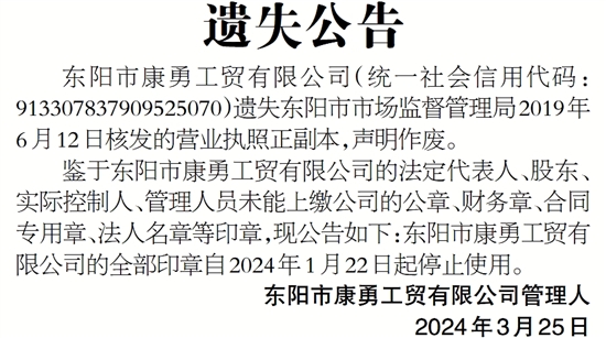 鉴于东阳市康勇工贸有限公司的法定代表人、股东、实际控制人、管理人员未能上缴公司的公章、财务章、合同专用章、法人名章等印章,现公告如下:东阳市康勇工贸有限公司的全部印章自2024年1月22日起停止使用。