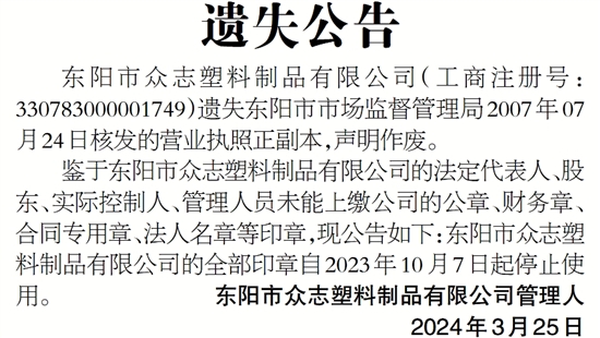 鉴于东阳市众志塑料制品有限公司的法定代表人、股东、实际控制人、管理人员未能上缴公司的公章、财务章、合同专用章、法人名章等印章,现公告如下:东阳市众志塑料制品有限公司的全部印章自2023年10月7日起停止使用。 东阳市众志塑料制品有限公司管理人