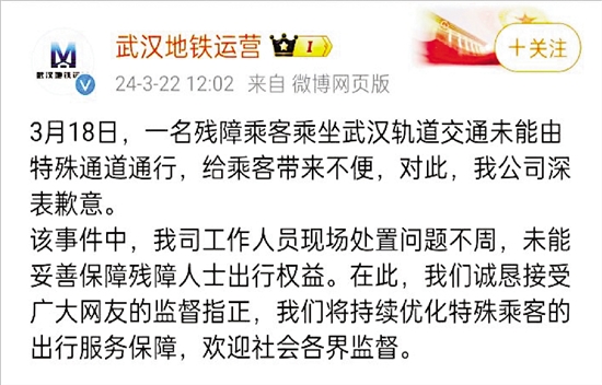 近日,一则“断臂男子在武汉欲免费乘坐地铁被工作人员要求出示残疾证”的新闻冲上热搜。该新闻一经发布就在社交媒体上引起了网友的广泛关注,事后,武汉地铁通过官方微博致歉。但不少网友仍表示“不愿原谅”,认为这种情况实在不应该发生,毕竟,“规矩是死的,人是活的”。