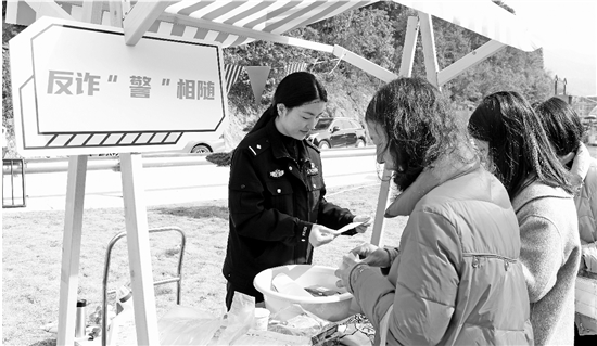 近日,临海市公安局沿江派出所联合沿江流管所开展反诈宣传。民辅警前往辖区龙角尖水库,向群众传授应对诈骗的方法,并提供流动人口服务。 通讯员 李雨潞