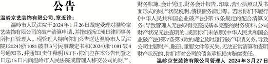 温岭市人民法院于2024年1月26日裁定受理对温岭京艺装饰有限公司的破产清算申请,并指定浙江昶日律师事务所担任管理人。现管理人特向你们公告送达温岭市人民法院(2024)浙1081破申3号民事裁定书和(2024)浙1081破4号通知书,并通知(责任释明)如下:你们应在本公告刊登之日起15日内向温岭市人民法院或管理人移交公司的财产、财务帐簿、会计凭证、财务会计报告、印章、营业执照以及书面形式的财产状况说明、债权债务清册等。若因你们不履行《中华人民共和国企业破产法》第15条规定的配合清算义务,导致管理人无法取得完整或基本完整的财务资料,公司财产状况无法查明的,或因你们未依照《中华人民共和国企业破产法》第7条第3款的规定及时履行破产申请义务,导致公司主要财产、账册、重要文件等灭失,无法正常清算和查明财产状况的,你们将对公司的债务承担损害赔偿责任。