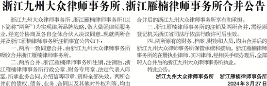 浙江九州大众律师事务所、浙江雁楠律师事务所(以下简称“两所”)为实现律所品牌战略,做大做强律师服务业,经充分协商及各自全体合伙人决议同意,现就两所合并及浙江雁楠律师事务所注销事宜公告如下: