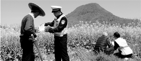 | 民(辅)警踏访田间宣讲交通安全。 |