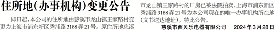 即日起,本公司的住所地由慈溪市龙山镇王家路村变更为上海市浦东新区秀浦路3188弄21号。原住所地慈溪市龙山镇王家路村的厂房已被法院拍卖,上海市浦东新区秀浦路3188弄21号为本公司现在的唯一办事机构所在地(文书送达地址)。特此公告。