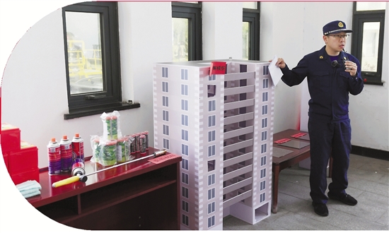 消防员专门定制了一个可模拟“烟囱效应”的模型和一个高层居民楼模型,并从市场上购买来普通玻璃、有机玻璃和防火玻璃,同时准备了秒表、红外测温仪、高温喷枪、固体酒精、烟雾弹等道具。