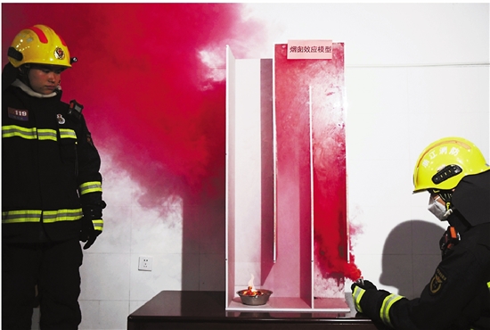 镇海区消防救援大队防火监督员张德起告诉记者,从此次实验的红色烟气流动情况可以看出,随着模型底部火源的持续燃烧,附近空气因升温而向上流动,模型通道内部产生气压差,导致右侧气流向左移动,气流速度随着模型左侧通道整体温度的升高而越来越快,这就是“烟囱效应”。