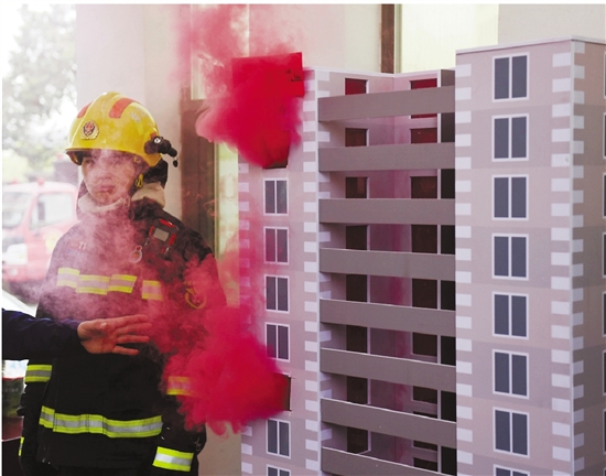 随后,消防员又拉开一枚烟雾弹,投入高层居民楼模型一层的入口。仅7秒钟,烟气便从居民楼其中的两处窗口涌出。