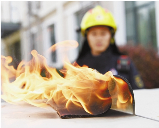消防员分别对普通玻璃、有机玻璃和防火玻璃进行高温喷枪火烧测试实验,模拟居民楼内不同材质玻璃的防火效果。