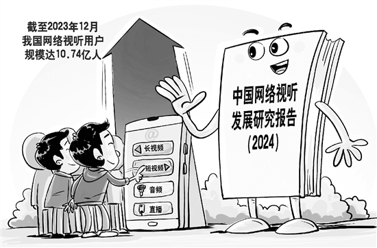 | 作为第十一届中国网络视听大会的重要活动,《中国网络视听发展研究报告(2024)》近日在成都发布。报告显示,截至2023年12月,我国网络视听用户规模达10.74亿人,网民使用率98.3%,网络视听“第一大互联网应用”地位愈加稳固。 新华社 王鹏 作 |