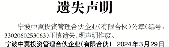 宁波中翼投资管理合伙企业(有限合伙)公章(编号:3302060253063)不慎遗失,现声明作废。