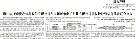 浙江省浙商资产管理股份有限公司与温州可争电子科技有限公司债权转让暨债务催收联合公告