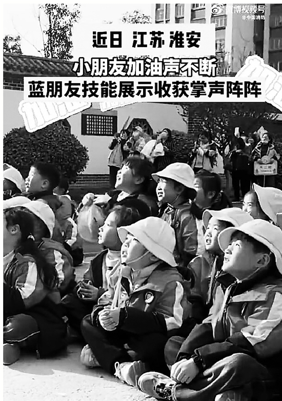 近日,江苏淮安,萌娃组团参观消防站,正好赶上消防员哥哥们训练。热情的小萌娃们化身临时“啦啦队”,一声声赞美此起彼伏。爬梯子速度快到模糊的“蓝朋友”在呐喊中逐渐“迷失”,“班长,我还能再快!”
