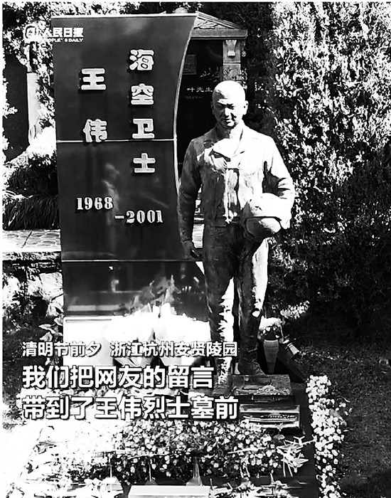 | 网友留言跨越山河来到王伟烈士墓前 @人民日报 (《人民日报》法人微博) 清明节前夕,我们把网友的思念和致敬带到了王伟烈士墓前,现场摆满鲜花、战机模型和卡片,场面令人泪目。2001年4月1日,王伟为保卫祖国领空,遭美机撞机被迫跳伞坠海,壮烈牺牲。英雄从未远去,我们不会忘记! |