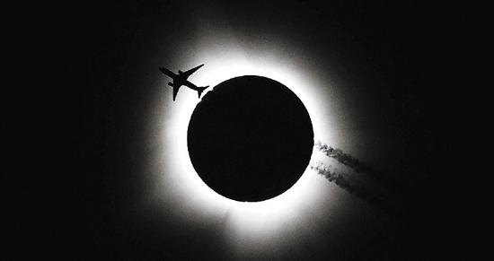 这是4月8日在美国印第安纳州布卢明顿拍摄的日全食景观和经过的飞机。