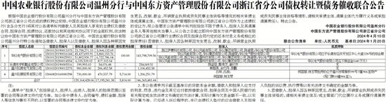 根据中国农业银行股份有限公司温州分行与中国东方资产管理股份有限公司浙江省分公司达成的债权转让安排,中国农业银行股份有限公司温州分行(含各分支行)将其对公告清单所列借款人及其担保人享有的主债权及借款合同、担保合同、抵债协议、还款协议和其他相关协议项下的全部权利,依法转让给中国东方资产管理股份有限公司浙江省分公司。中国农业银行股份有限公司温州分行特公告通知各借款人、担保人以及借款人、担保人因各种原因发生更名、改制、歇业、吊销营业执照或丧失民事主体资格等情况的相关承债主体或清算主体。中国东方资产管理股份有限公司浙江省分公司作为上述债权的受让方,现公告要求公告清单中所列包括但不限于债务人、担保人及其清算业务人等其他相关当事人,从公告之日起立即向中国东方资产管理股份有限公司浙江省分公司履行主债权合同及担保合同约定的还本付息义务或相应的担保责任(若借款人、担保人因各种原因发生更名、改制、歇业、吊销营业执照或丧失民事主体资格等情形,请相关承债主体、清算主体代为履行义务或承担清算责任)。特此公告。