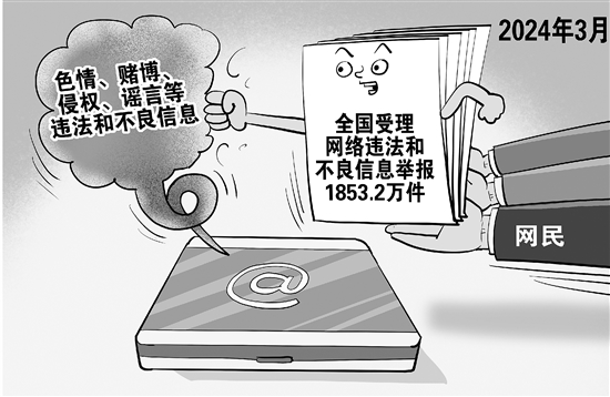 中央网信办举报中心近日公布的统计数据显示,3月,中央网信办举报中心指导全国各级网信举报工作部门、主要网站平台受理网民举报色情、赌博、侵权、谣言等违法和不良信息1853.2万件,环比增长0.4%、同比增长10.9%。