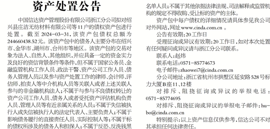 受理征询或异议有效期:20工作日,如对本次处置有任何疑问或异议请与浙江分公司联系。