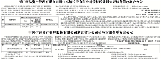 浙江浙易资产管理有限公司浙江卓毓控股有限公司债权转让通知暨债务催收联合公告