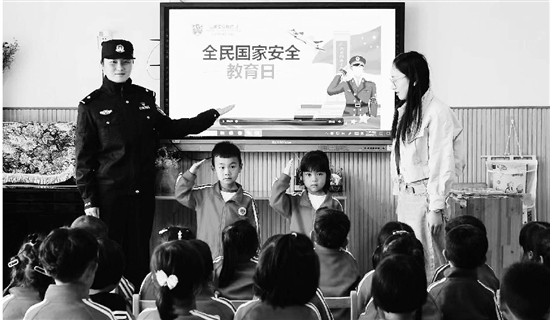 近日,天台县白鹤镇中心幼儿园邀请县公安局治安大队民警走进幼儿园,为孩子们进行国家安全教育。民警借助知识展板、动画短片等,为孩子们普及国家安全知识,认识国家安全的意义,推动新时代全民国防教育的普及深入。