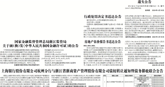 根据上海银行股份有限公司杭州分行与浙江省浙商资产管理股份有限公司于2024年[3]月[27]日签署的《金融不良资产债权转让合同》及其附件,上海银行股份有限公司杭州分行(含各分支行)已将其依法享有的对下列公告清单中所列借款人及其担保人享有的主债权及担保合同项下的全部权利,依法转让给浙江省浙商资产管理股份有限公司。上海银行股份有限公司杭州分行特公告通知各借款人及担保人。浙江省浙商资产管理股份有限公司作为下列债权的受让方,现公告要求下列清单中所列债务人及其担保人,从公告刊登之日起立即直接向浙江省浙商资产管理股份有限公司履行主债权合同及担保合同约定的还本付息义务或相应的担保责任。特此公告。