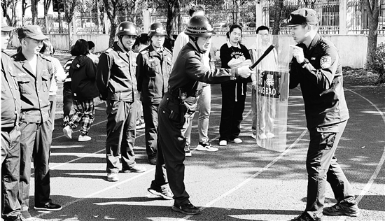 近日,台州市公安局椒江分局巡特警大队联合海门派出所,结合勤廉公安建设,组织民警深入校园,教授保安员正确使用警棍、盾牌等装备,进一步提升他们应对突发事件的能力和水平。
