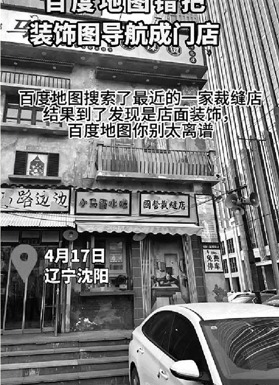 4月16日,辽宁沈阳。市民通过百度地图搜索最近一家裁缝店,结果到了发现是店面装饰,吐槽地图导航过于离谱。“百度地图”官方账号致歉:抱歉给您带来不好的体验,您反馈的问题已经收到,已反馈至内部核实处理。不少网友晒图表示,4年前也被这家装饰骗过,至今都没改。百度地图客服表示,可能是有人自行新增地点所致,可根据客服提示操作进行报错删除。