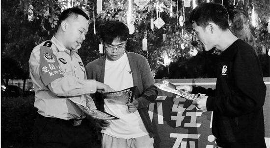 近日,温州市公安局龙湾区分局天河派出所民警来到天河街道庄泉村滨水防诈主题公园开展反诈宣传。民警为“反诈大榕树”挂上彩灯和反诈书签,利用居民们的晚间休闲时光,送上丰富的“反诈套餐”。