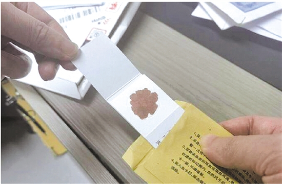| 寻亲者寄来涂满血液的采血卡。 胡宗昊 摄 |
