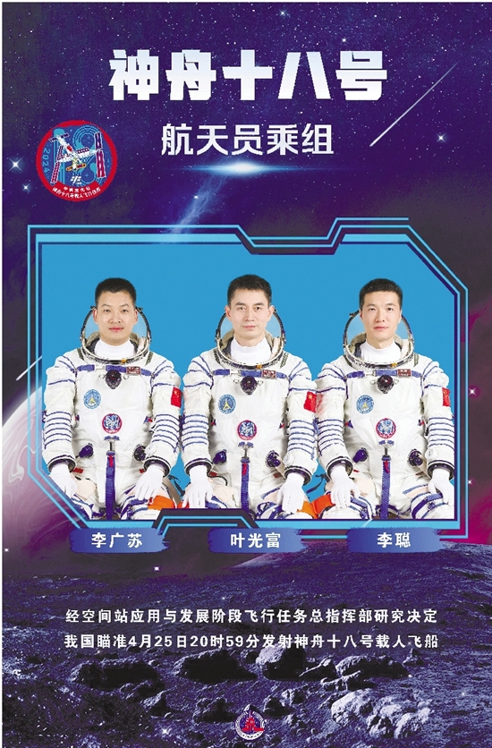 我国瞄准4月25日20时59分发射神舟十八号载人飞船,飞行乘组由航天员叶光富、李聪、李广苏组成。