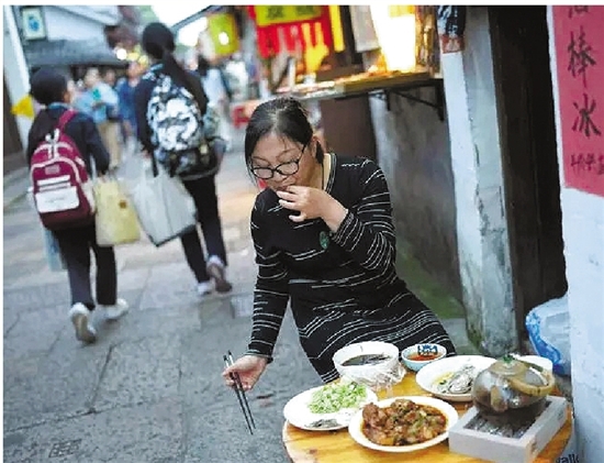 绍兴仓桥直街,人来客往。傍晚,居民童秀娟把小饭桌搬到家门口,倚街而坐,拈起一只醉虾嘬起来。寻常烟火味,弥散开来。