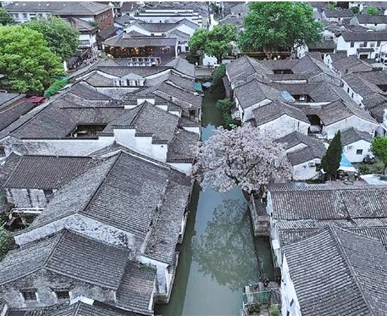 从山西来的仝女士,在老街一处斑驳的墙壁旁给同伴拍照。“想象中的江南水乡,就是这个样子。”她说。