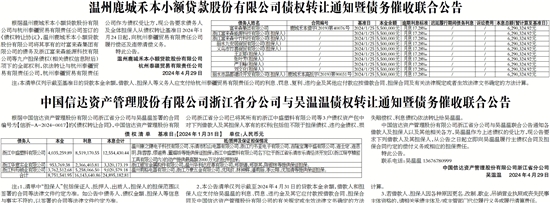 中国信达资产管理股份有限公司浙江省分公司与吴温温联合公告通知各借款人及担保人以及其他相关各方,吴温温作为上述债权的受让方,现公告要求下列借款人及其担保人,从公告之日起立即向吴温温履行主债权合同及担保合同约定的偿付义务或相应的担保责任。