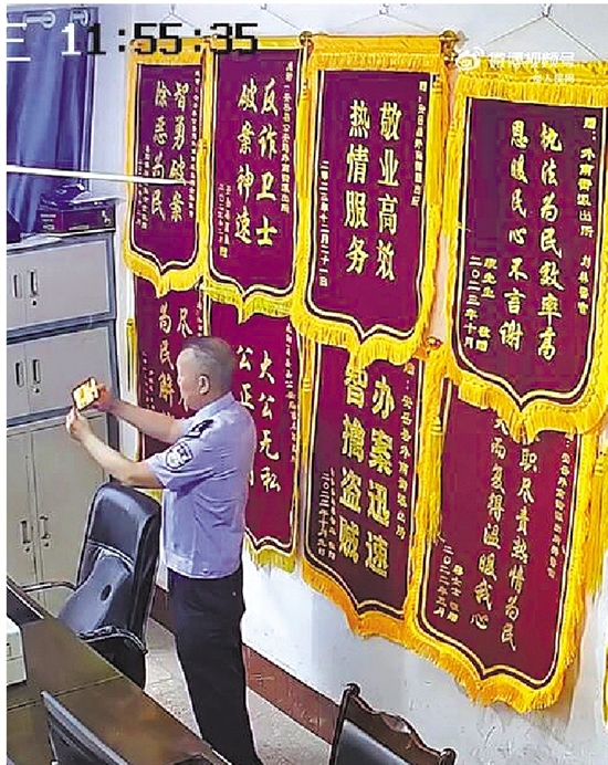 近日,四川资阳,从警38年即将退休的老民警最后一次值班时,特意穿上新警服,与曾经的“老战友们”合影留念。网友:他望向满墙的锦旗,是不舍也是告别。