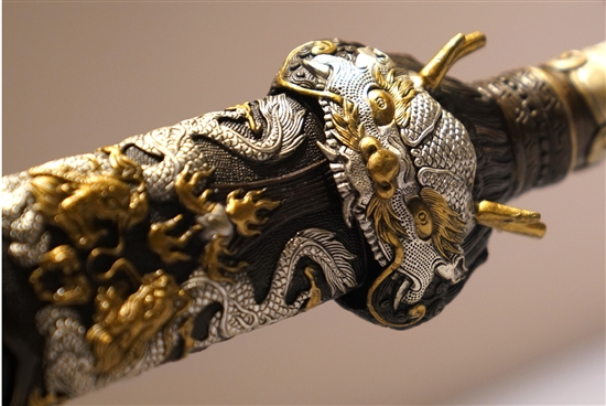 | 为期一个月的“剑出龙泉——龙泉宝剑精品展”日前在浙江省博物馆开展。此次展览围绕甲辰龙年主题,汇集当代34位铸剑名家精品,展现龙泉宝剑锻制技艺这项国家级非物质文化遗产的精华与风貌。 图为5月7日拍摄的正在展出中的一款龙泉宝剑作品局部。 新华社 韩传号 摄 |