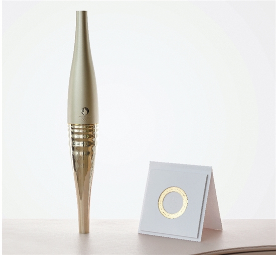 | 5月6日,巴黎奥组委正式公布了奥运及残奥火炬接力火种台的设计方案,该火种台由设计了巴黎奥运火炬的法国著名设计师马修·勒汉纽尔操刀完成,实物形象上与奥运火炬也高度融合;同时还公布了给每位火炬手的纪念品——名为“火炬之心”的圆环。图为巴黎奥运火炬与“火炬之心”。 新华社发 巴黎奥组委供图 |