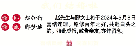 赵先生与郦女士将于2024年5月8日喜结连理。愿修百年之好,共赴白头之约。特此登报,敬告亲友,亦作留念。