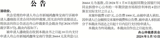 我会受理的申请人舟山市新城鸿鑫珠宝商行诉被申请人潘晓俊买卖合同纠纷仲裁案,因无法向你直接送达,现依法向你公告送达舟山仲裁委员会裁决书[(2024)舟仲裁字第3号],裁决内容如下: