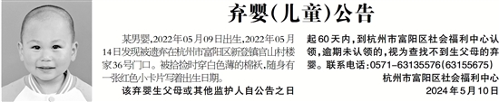 某男婴,2022年05月09日出生,2022年05月14日发现被遗弃在杭州市富阳区新登镇官山村楼家36号门口。被拾捡时穿白色薄的棉袄,随身有一张红色小卡片写着出生日期。