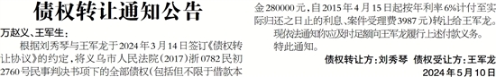 根据刘秀琴与王军龙于2024年3月14日签订《债权转让协议》的约定,将义乌市人民法院(2017)浙0782民初2760号民事判决书项下的全部债权(包括但不限于借款本金280000元,自2015年4月15日起按年利率6%计付至实际归还之日止的利息、案件受理费3987元)转让给王军龙。