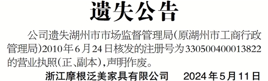 公司遗失湖州市市场监督管理局(原湖州市工商行政管理局)2010年6月24日核发的注册号为330500400013822的营业执照(正、副本),声明作废。