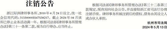 根据司法部《律师事务所管理办法》第三十二条第三款规定,现我局向社会公告,并直接报浙江省司法厅办理注销手续。律师事务所被注销后的债权、债务由其设立人或合伙人承担。