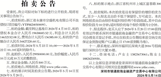十、报名程序:竞买人应于2024年5月20日17:00前持有效证件联系深圳市银通前海金融资产交易中心有限公司办理竞买登记手续,并应在拍卖公告期结束前交纳交易保证金到指定账户(以截止日17:00前到账为准)。