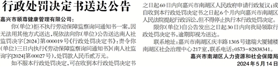 你(单位)拒不执行劳动保障监察询问通知书一案,因无法用其他方式送达,现依法向你(单位)公告送达南人社监罚决字〔2024〕第000019号《行政处罚决定书》:责令你(单位)三日内执行《劳动保障监察询问通知书》(南人社监询字[2024]第00027号),处罚款人民币贰万元。
