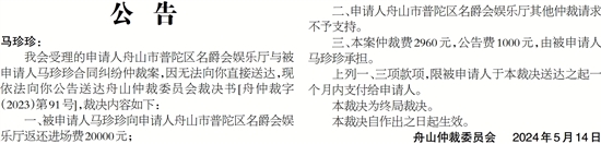 我会受理的申请人舟山市普陀区名爵会娱乐厅与被申请人马珍珍合同纠纷仲裁案,因无法向你直接送达,现依法向你公告送达舟山仲裁委员会裁决书[舟仲裁字(2023)第91号],裁决内容如下: