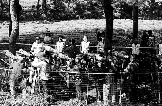 “这是领角鸮,请大家保持安静与文明,不要让初来乍到的它们感到害怕。”“大家要保持一定距离,文明拍摄,切勿踩踏茶地。”“长枪短炮”间,这支义警队格外显眼。义警队员们身着荧光绿马甲,一边劝导,一边将围观群众有序引导到安全位置。“特别在夜间,千万不能用强光拍摄领角鸮一家,否则会对领角鸮宝宝的视力造成不可逆的损害,甚至导致幼崽受惊出现应激死亡。”义警中有不少人对野生鸟类保护很有研究,他们发挥自己的专业优势,耐心向群众解释。有的义警队员还自发做了一块领角鸮的科普牌,帮助群众熟悉这几名“新客人”。